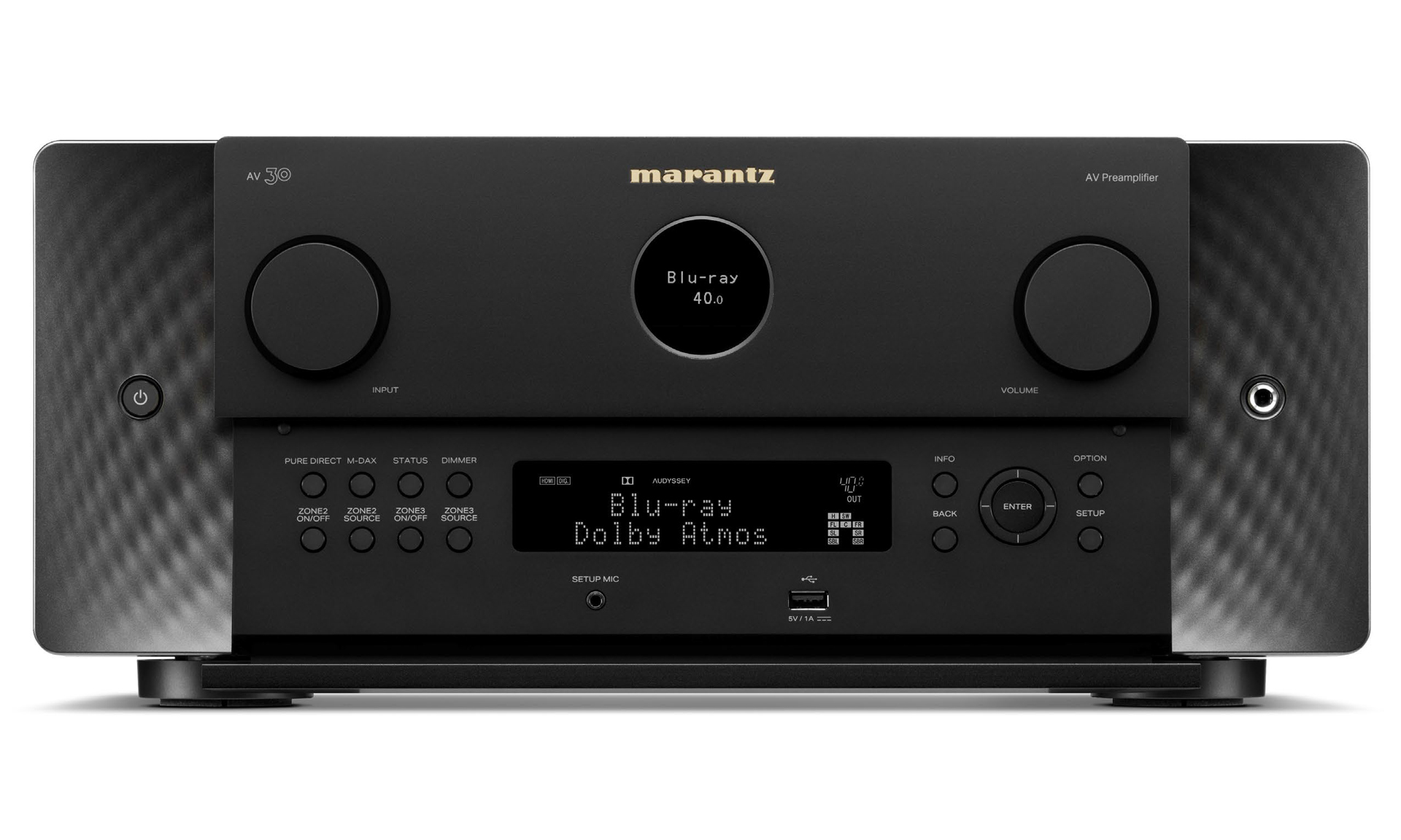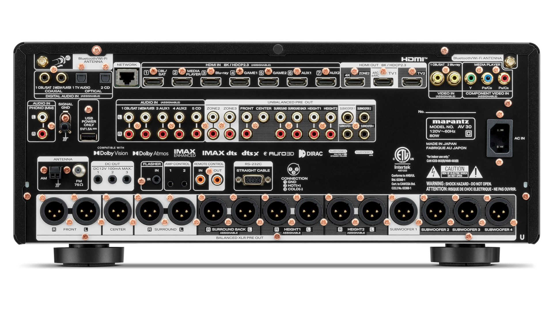 Con diferentes configuraciones de sistema, el AV 30 incluye múltiples entradas y ofrece salidas RCA y balanceadas para todos los canales, incluyendo cuatro subwoofers independientes. Naturalmente, el AV 30 admite contenido Dolby Atmos, DTS:X y AURO-3D; incorpora circuitos discretos Marantz HDAM para una calidad de sonido optimizada, además de siete entradas HDMI compatibles con 8K.